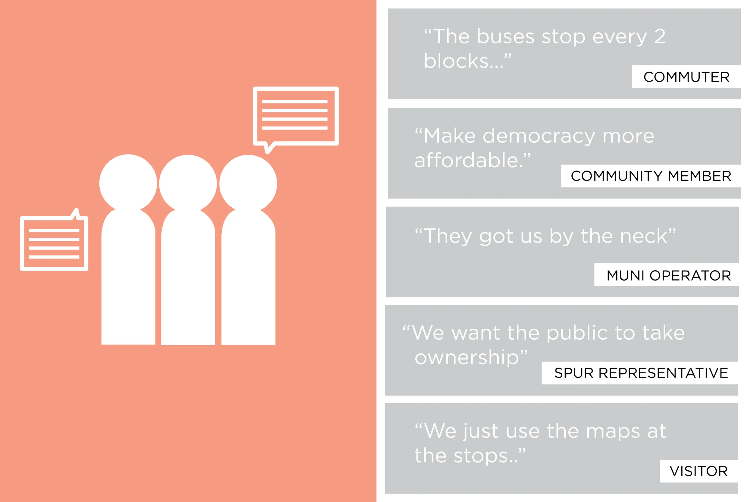 I spoke to a variety of stakeholders involved including MUNI operators, commuters, visitors, a transit authority consulting agency, SFMTA employee, and a SPUR representative. With the SFMTA user audience being the entire general public, I encountered many different opinions and user stories.